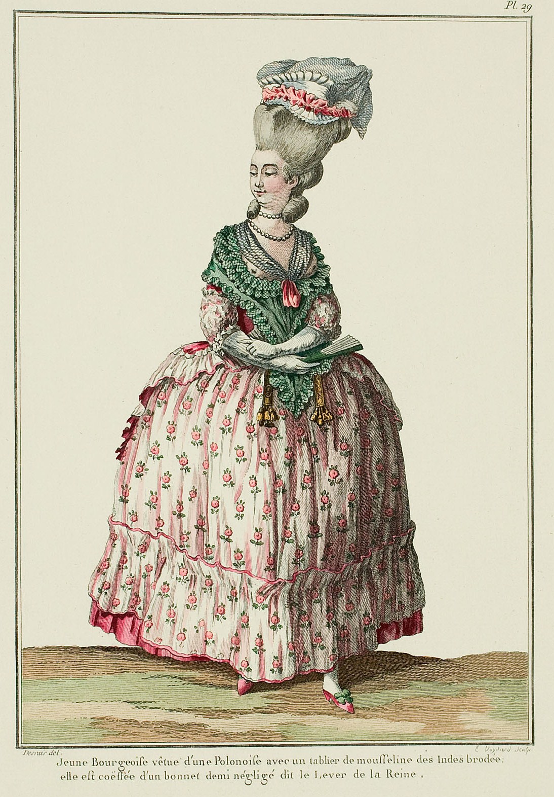 In the Print, the polonaise is trimmed with Indian gauze with bouquets on it: the apron is of the same stuff, and two cords of hair and gold hang from the top of the belt with their charms.