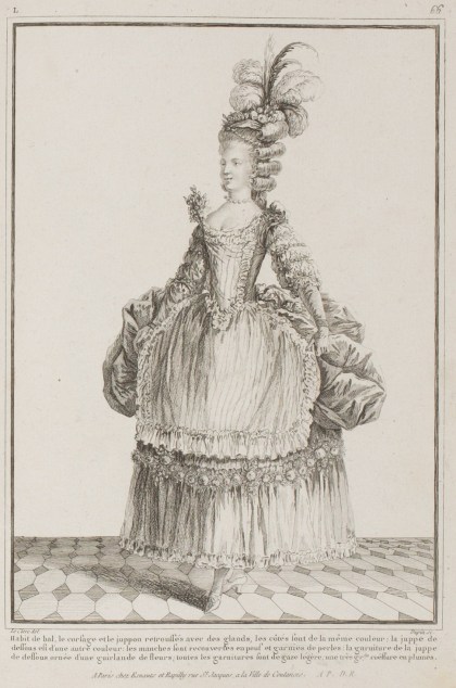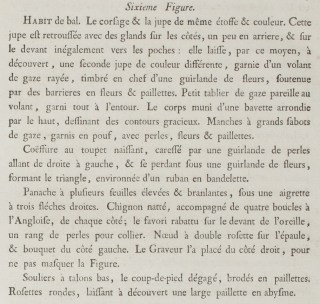 Panache of several raised and wobbly leaves on an aigrette of three straight feathers. Braided chignon, with four curls à l’Anglaise on each side; the favori tilted in front of the ear. A row of pearls for a necklace. Double bow on the shoulder, and a bouquet on the left. The Printer has placed it on the right side to keep from hiding the Figure.
