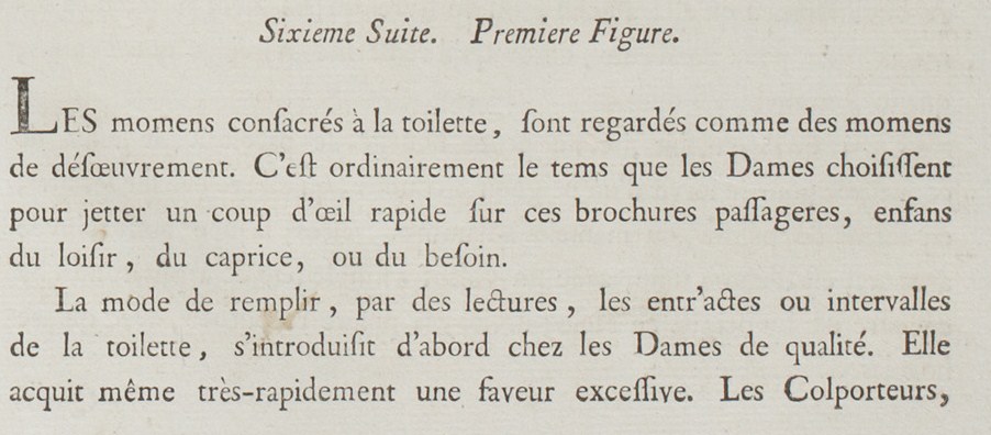 The fashion of filling the entr’actes or intermissions of the toilette with reading was introduced first in the homes of the Ladies of quality. It very quickly gained excessive favor. Peddlers and booksellers became useful men, and the most superficial pamphlets were able to boast that they had enjoyed at least a few minutes of existence.