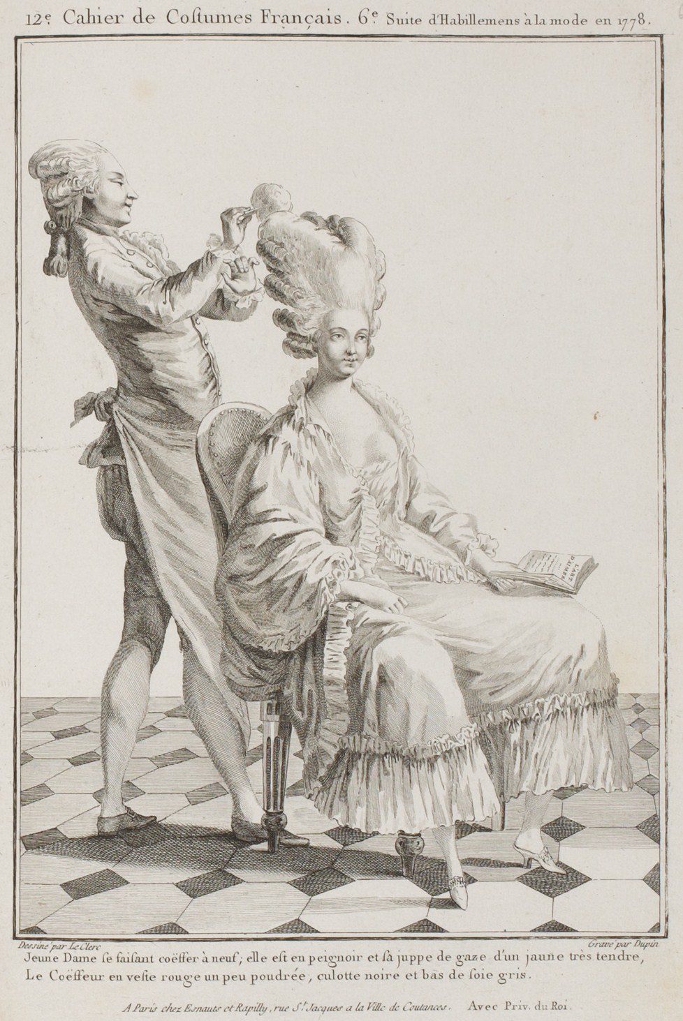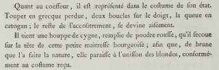 He holds a brush of swan feathers full of red powder, which he shakes on the head of this little middle-class mistress; to the end that, which nature made brown, she seems in unison with blondes, conforming to the received dress.
