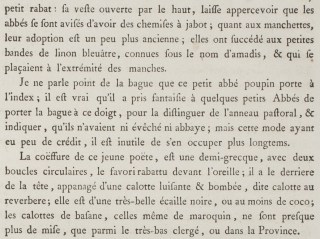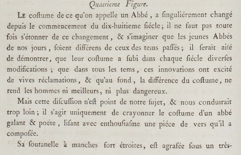 The costume of what one calls an Abbé has singularly changed since the beginning of the eighteenth century; one should not at any time be surprised by this change and imagine that the young Abbés of our time are different than those of the past; it will be easy to demonstrate that their costume has sustained diverse modifications in each century; that in all eras these innovations have excited lively protests, and that at bottom, the difference in costume makes the men neither better nor more dangerous.