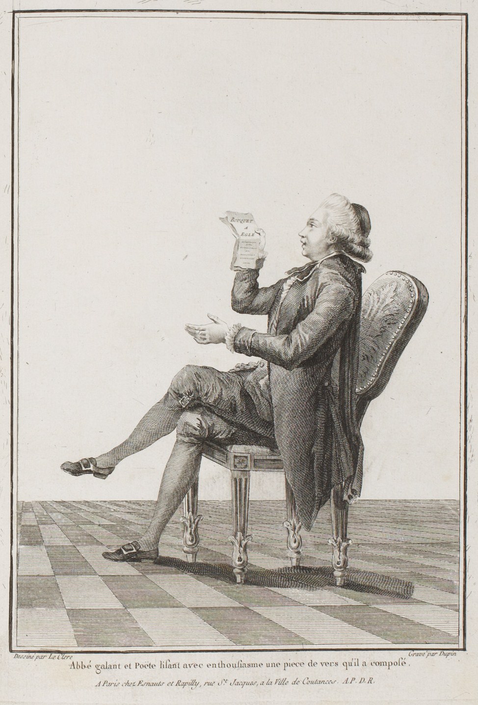 But this discussion is not our subject, and we are driving too far; one is only only meant to sketch the costume of a genteel and poetic abbé, reading with enthusiasm a piece of verse that he has composed.