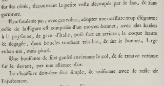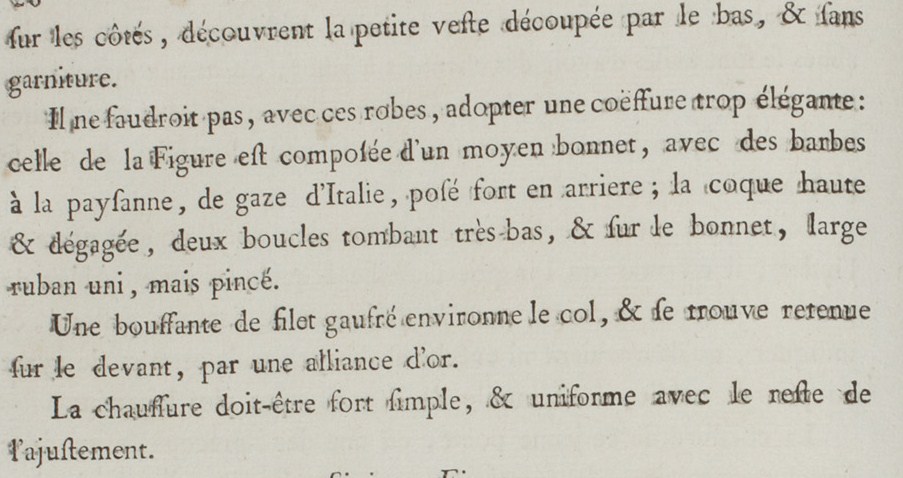It would not do, with these gowns, to adopt a too-elegant coiffure: that of the Figure is composed of a medium cap with peasant-style lappets, of Italian gauze, positioned mostly in the back; the coque is high and separate, with two curls falling very low, and on the cap a large but pincé solid-colored ribbon.