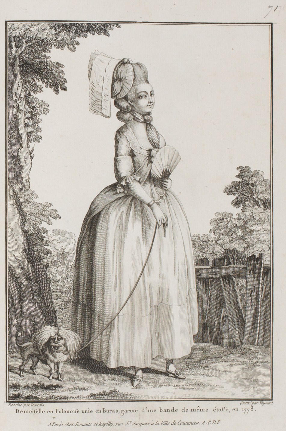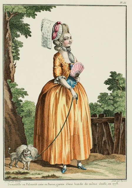 Jean-Jacques Rousseau, citizen of Geneva, after having strongly declaimed against the swaddling of infants and the normal manner of dressing them, at last had the satisfaction of making converts: children were raised and dressed following the method he had indicated; but the simplicity he tried to introduce into men’s and women’s dress did not have the same success. It was not until 1778, sometime after the death of that celebrated Philosopher, that people hazarded to make gowns along the principals of that Author, and it was with the polonaises that they made this attempt; they were known by the name of “Jean-Jacques” polonaises: the one which the Figure represents is of that type.