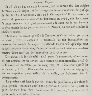 Anyway, the caraco shown in the Print is not that which was worn in 1768; it is a polonaise caraco, and its introduction was not until 1772. The scrupulous exactitude that is required for everything regarding fashion has not permitted passing under silence the two errors escaping from the impression of the Print.