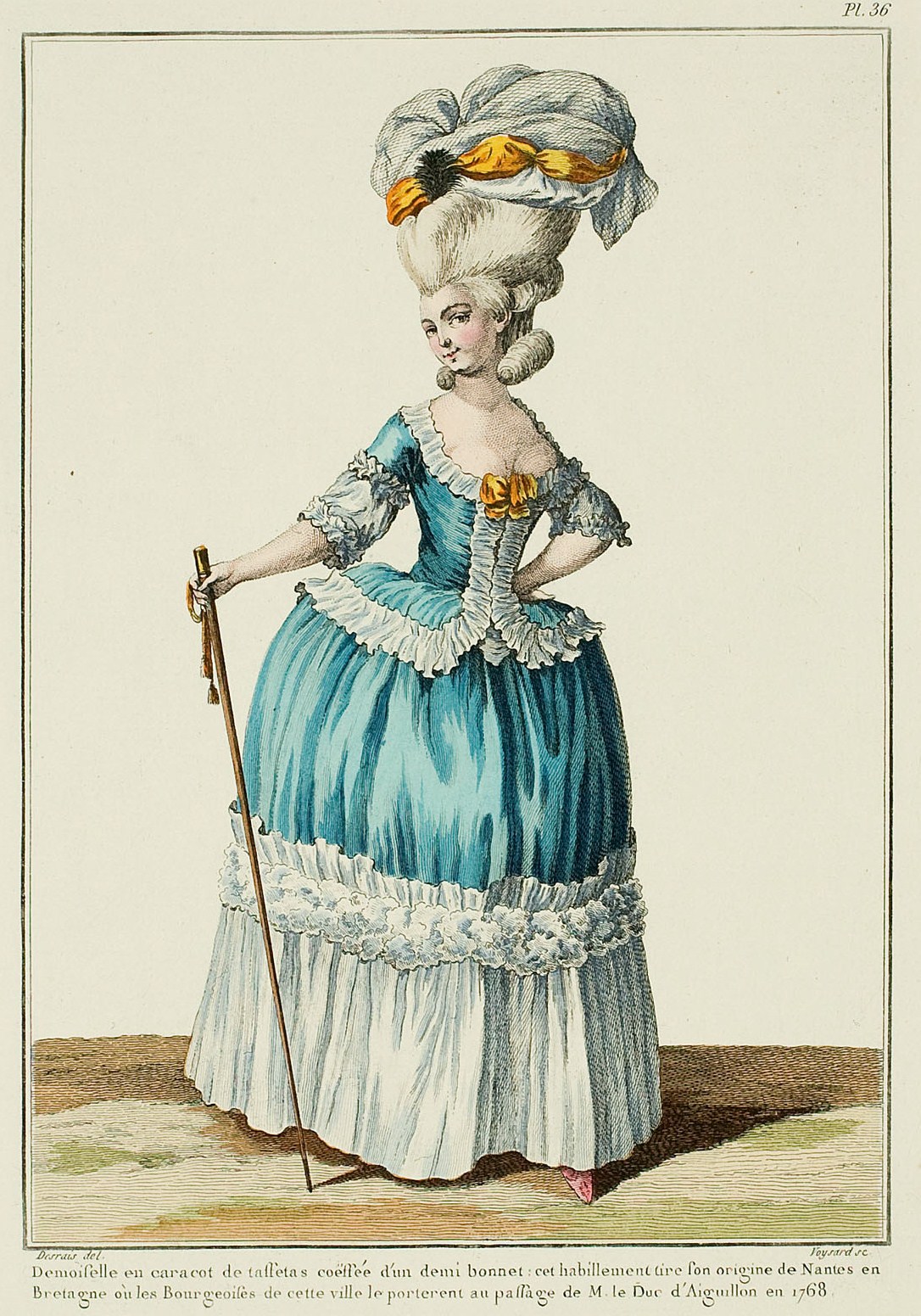 It is said at the bottom of this Print that the caraco derives from Nantes in Brittany, where the bourgeoises wore it at the passage of M. the Duke d’Aiguillon, in 1768. This revelation is not exact: the caraco is older, but it was only in 1768 that respectable women appeared in public dressed in caracos, and this fashion overall had the greatest favor among the ladies of Nantes, where it was kept for many years.