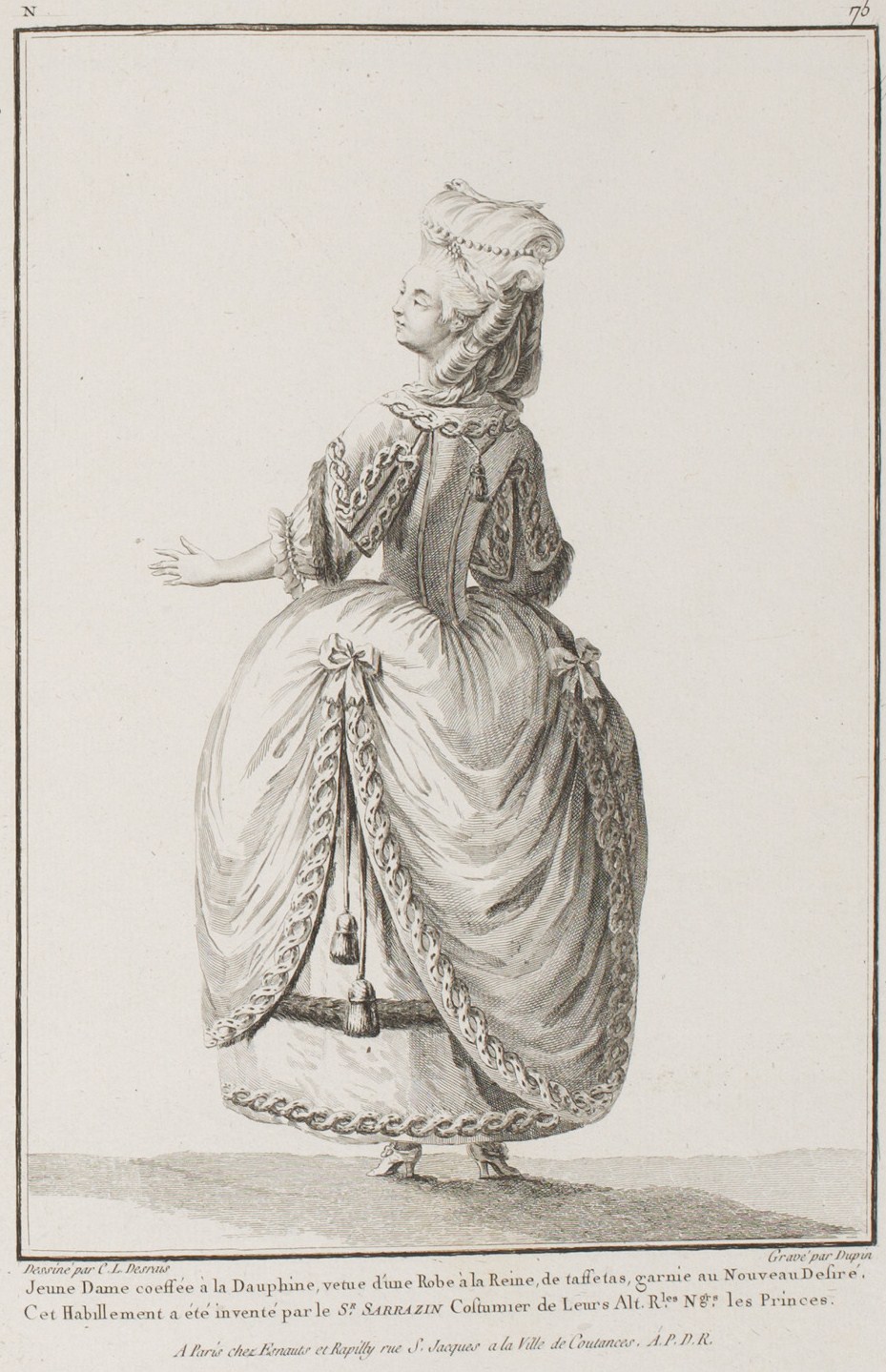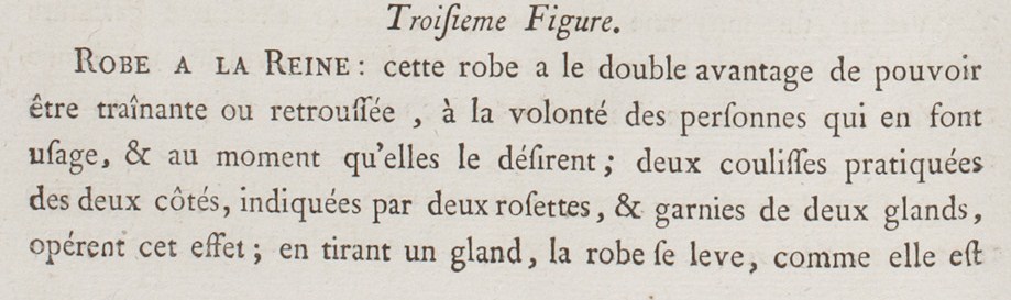 Robe à la Reine: this gown has the double advantage of being able to be worn trailing or pulled up, at the will of the people who are wearing it and at the moment they choose; two drawstrings, placed on two sides, indicated by two bows, and trimmed with two tassels, create this effect; in pulling one tassel, the gown lifts, as it is in the Drawing; in pulling the other, it descends and becomes hanging; this change is made in an instant.