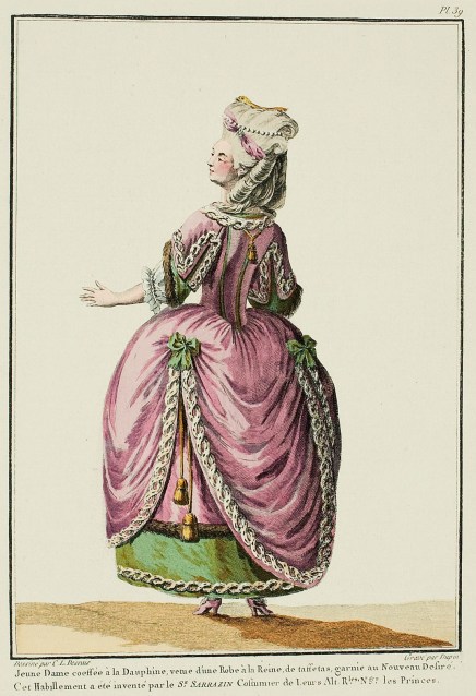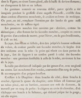 Hair à la Dauphine: two curls on the side, two curls en crochet,* holding a dolphin’s tail; this hairstyle is surmounted with a pinched ribbon placed en barriere, holding a diamond rose and crossed by a row of pearls. The chignon is in a knight’s cross, from which escapes a curl à la Sultaine which descends to the throat, where it ends.