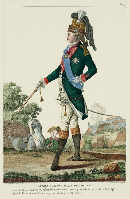 Galerie des Modes, 14e Cahier, 5e Figure November 8, 2012February 28, 2024 ~ Cassidy Percoco ARTOIS DRAGOONS, COLONEL’S UNIFORM Dark green Wool suit, straight collar, cuffs, revers, pocket flaps of red Wool spotted with white, white buttons, vest and breeches of white Wool. Share this: Click to share on Facebook (Opens in new window) Facebook Click to email a link to a friend (Opens in new window) Email Click to share on Tumblr (Opens in new window) Tumblr Click to share on X (Opens in new window) X Click to share on Bluesky (Opens in new window) Bluesky Like Loading... Related Published by Cassidy Percoco View all posts by Cassidy Percoco