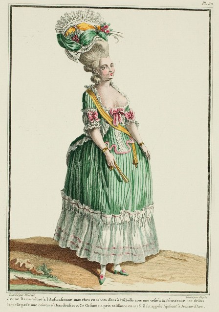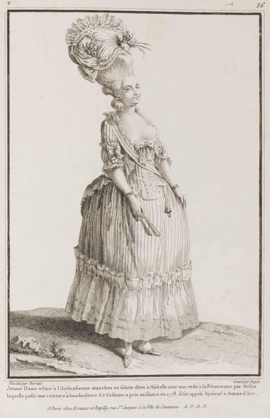 Anyway, this Figure is dressed in a gown called à l’Austrasienne; it is a type of polonaise that is very open in the front and which is thrown entirely to the back, where it is held very high; under this gown is a vest à la peruvienne, surmounted by a contentement matching the bows on the sabot cuffs. The trim winds around the collar in the shape of a demi-medicis: the whole is cut by a ribbon placed like a baldric; very full volant, trimmed at the top and bottom with plain ribbons like the baldric.