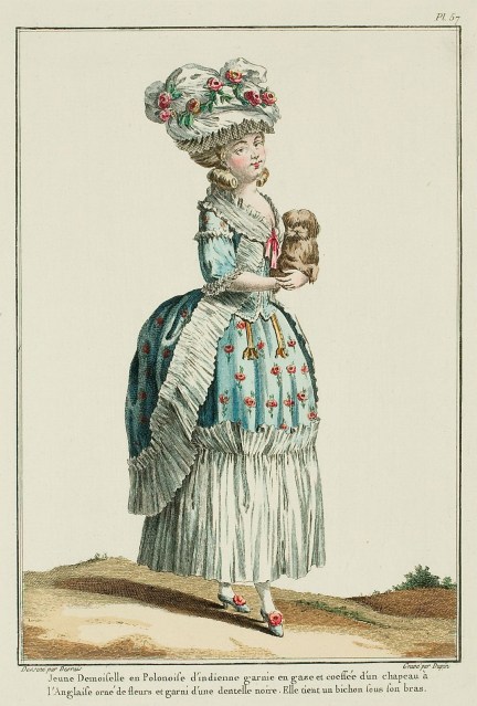 The fashion of carrying a dog under the arm has repeatedly been in effect and then discredited: it was adopted in France, even by men, in the sixteenth century, during the reign of Henri III; Brantome* reported that this Prince gave a Seigneur of the Court the Order of the Holy Spirit for getting him little Turkish dogs which were considered as the prettiest in Europe. They were put then in little baskets, gallantly decorated, which one suspended from the collar with a cord or ribbon. These baskets were placed on the left arm for walking, and when one was seated, they were put on one’s knee. The fashion of carrying dogs came back to favor among ladies of the eighteenth century, but the baskets of Henri III’s era were supplanted, and little lapdogs had the honor of preference, like the one that can be seen in the Print.