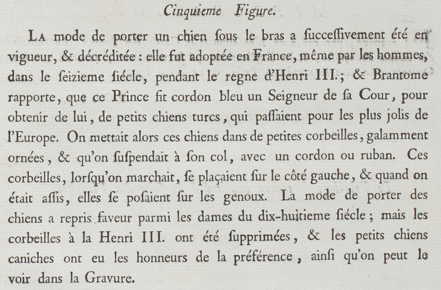 The fashion of carrying a dog under the arm has repeatedly been in effect and then discredited: it was adopted in France, even by men, in the sixteenth century, during the reign of Henri III; Brantome* reported that this Prince gave a Seigneur of the Court the Order of the Holy Spirit for getting him little Turkish dogs which were considered as the prettiest in Europe. They were put then in little baskets, gallantly decorated, which one suspended from the collar with a cord or ribbon. These baskets were placed on the left arm for walking, and when one was seated, they were put on one’s knee. The fashion of carrying dogs came back to favor among ladies of the eighteenth century, but the baskets of Henri III’s era were supplanted, and little lapdogs had the honor of preference, like the one that can be seen in the Print.