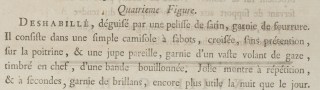 Deshabillé, disguised with a satin pelisse trimmed with fur. it consists of a simple camisole with sabot cuffs, which crosses without pretension over the chest, and a matching petticoat trimmed with a vast volant of gauze, headed with a bouillonné band. Pretty repeating watch with seconds, ornamented with brillants, as useful in the night as in the day.*