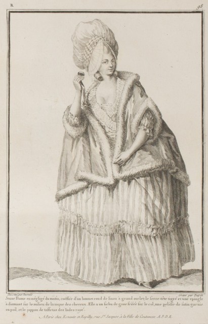 Young Woman in morning negligée, coiffed with a round linen cap with a large hem; the streaked headband and a diamond pin on the middle of the toque of the hair. She has a frilled gauze fichu on her collar, a satin pelisse trimmed with fur, and the petticoat of striped Indian taffeta. (1779)