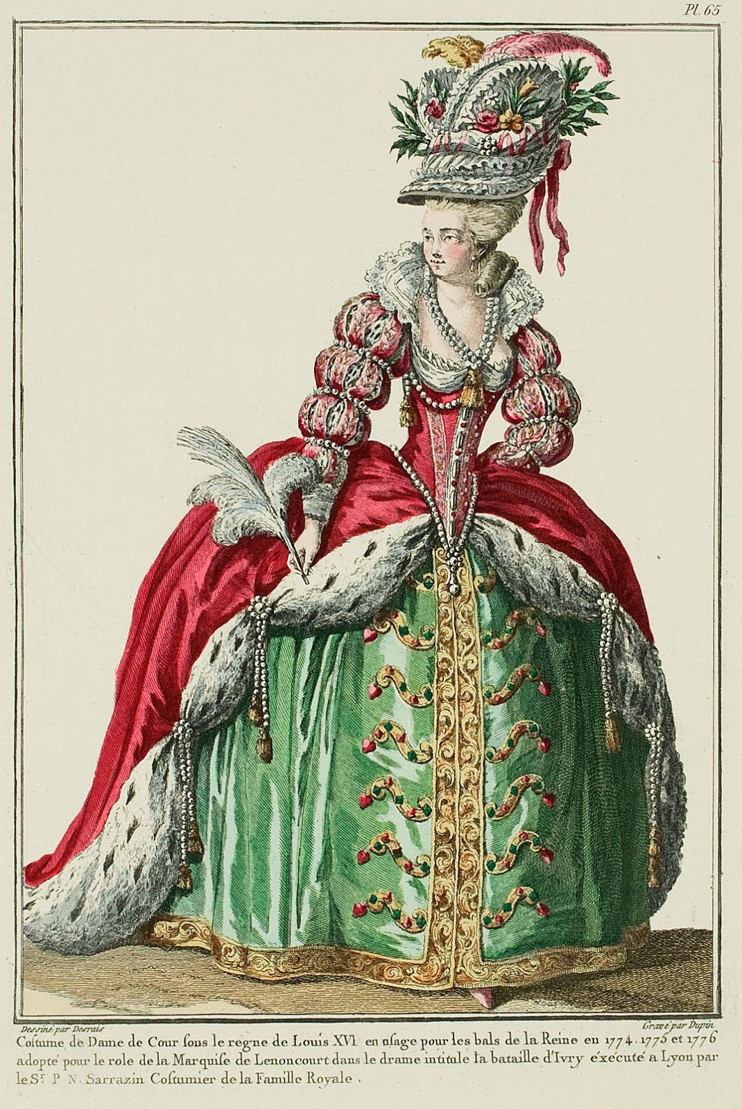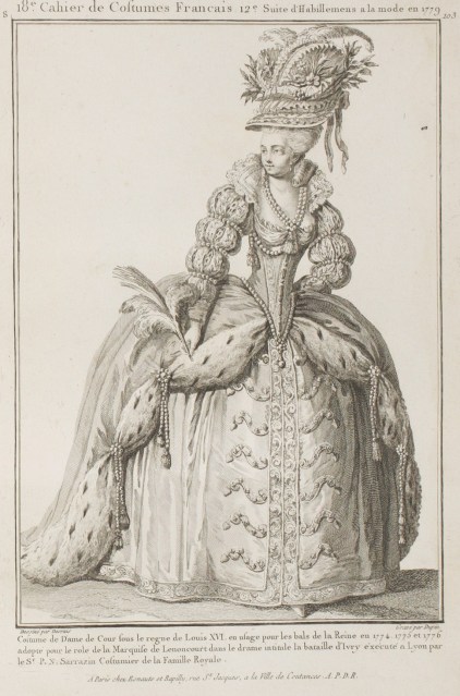 Costume of a Lady of the Court during the reign of Louis XVI, in use for the Queen’s balls in 1774, 1775, and 1776, adopted for the role of the Marquise de Lenoncourt in the drama called “the Battle of Ivry”, executed in Lyon by Sr. P. N. Sarrazin, Costumer of the Royal Family. (1779)