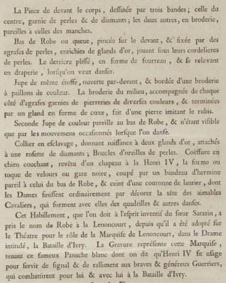 This Dress, which must be from the inventive spirit of Sir Sarazin, took the name of Robe à la Lenoncourt, since it was adopted in the Theatre for the role of the Marquise de Lenoncourt, in the Drama called “the Battle of Ivry”. The Print represents this Marquise, holding the famous white Panache which Henri IV used to signal and rally the brave and generous Warriors, which fought for him and with him at the Battle of Ivry.**