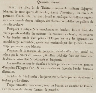 Ball and Theatrical dress, imitating the Spanish costume. Three-quarter circle cape, furred with ermine, the inner border and parement of plain gold tissue, embroidered in a mosaic of silver sequins; in the center of each lozenge, gems or groups of spangles in varied colors.