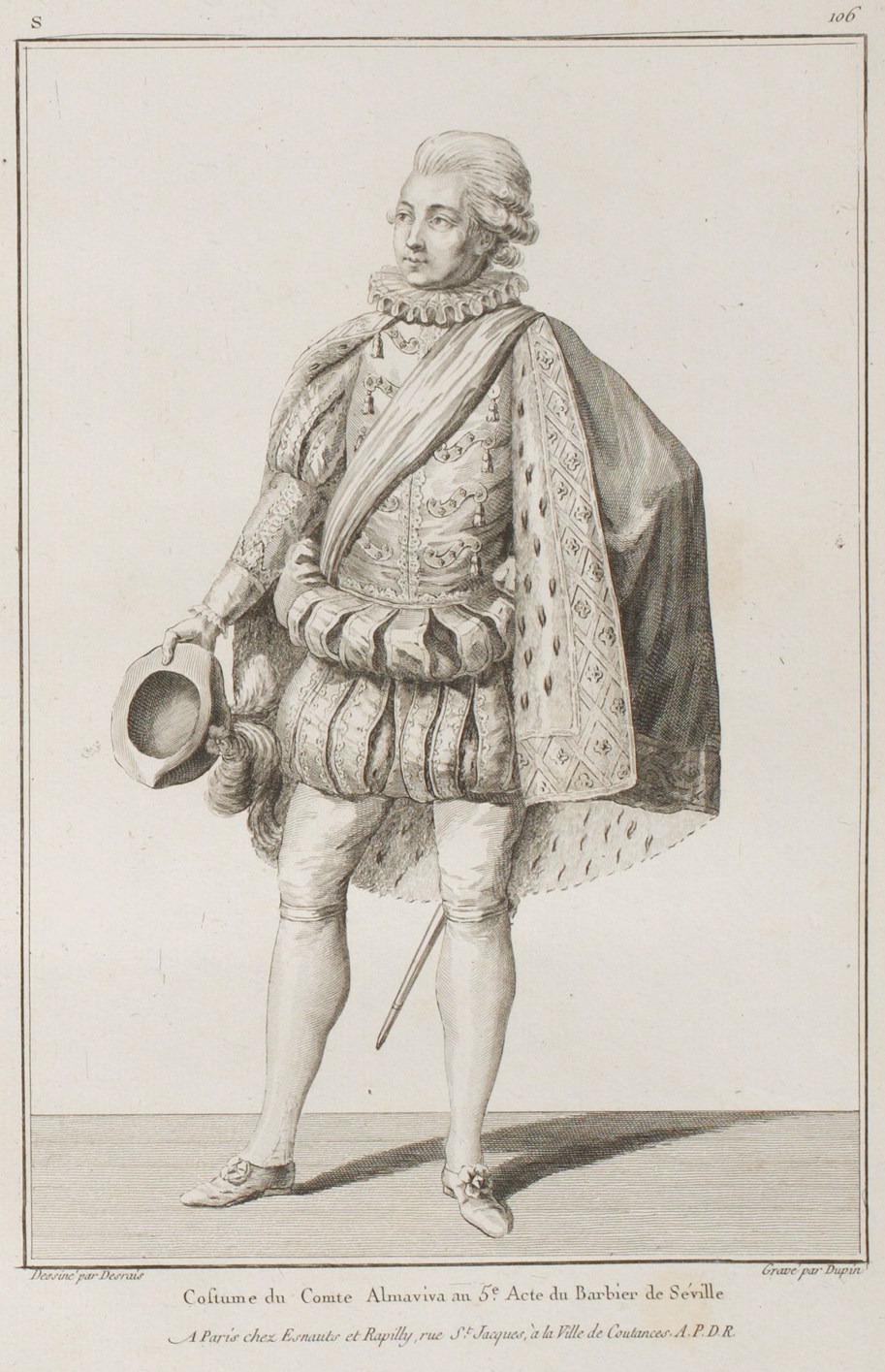 The trews or high-breeches are cut in bands matching the cape, trimmed with gold point d’Espagne, and the slashes or second bands are furred with ermine.