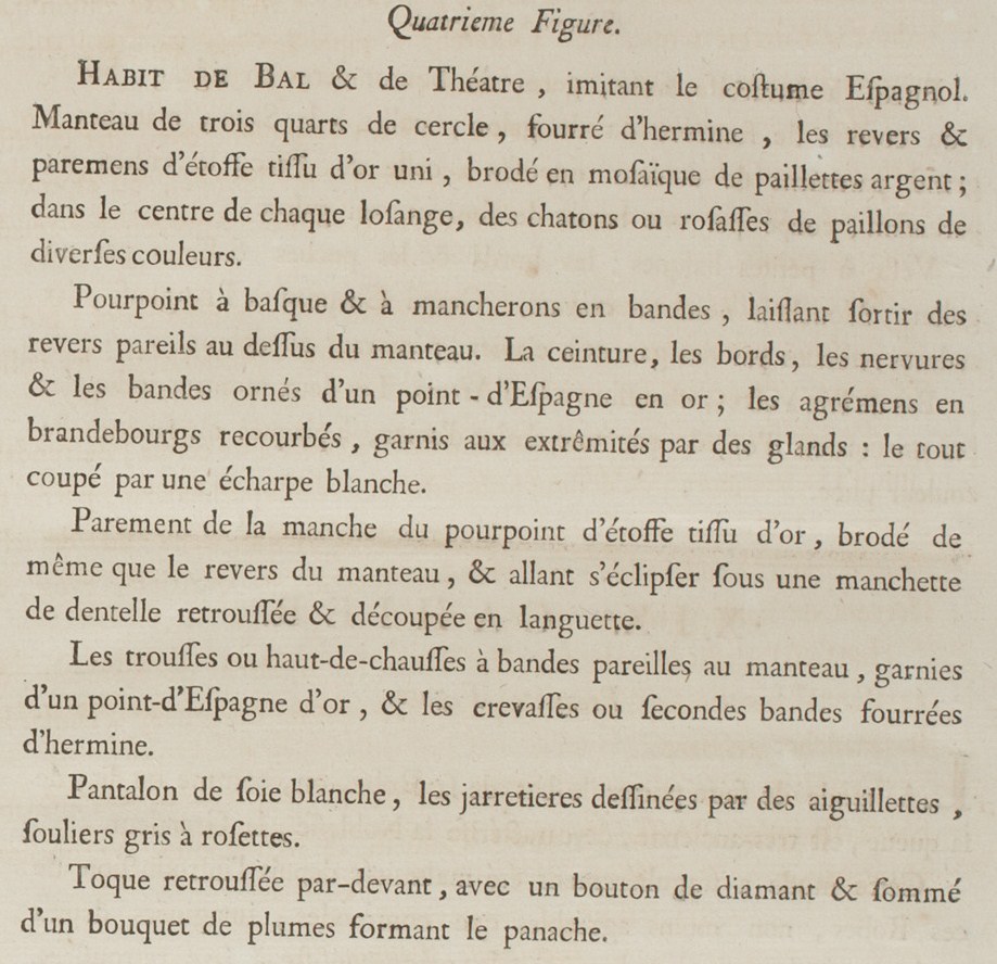 Ball and Theatrical dress, imitating the Spanish costume. Three-quarter circle cape, furred with ermine, the inner border and parement of plain gold tissue, embroidered in a mosaic of silver sequins; in the center of each lozenge, gems or groups of spangles in varied colors.