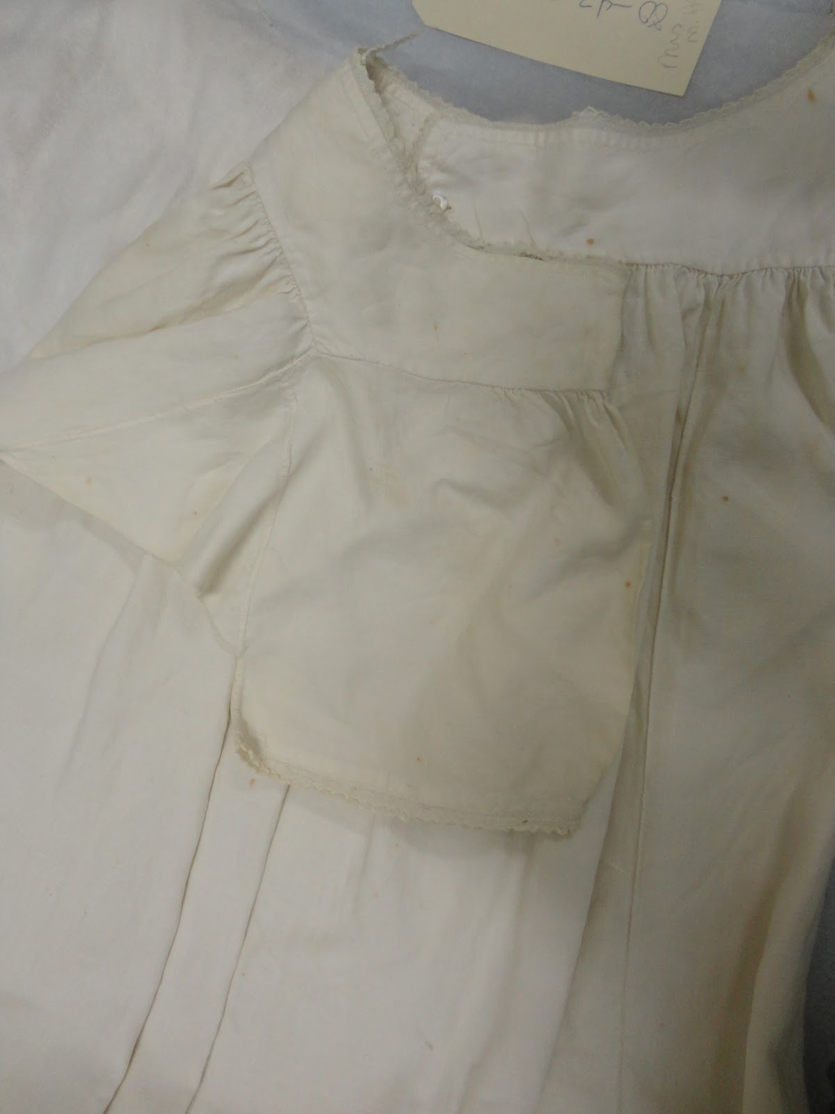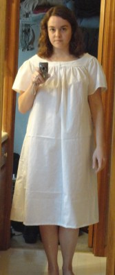 I took this pattern from a chemise at the Chapman Historical Museum. The original was made of a very fine linen, so worn it was kind of shiny; mine is a cheap muslin. I did sew it by hand, however, using a fairly logical sequence of steps: