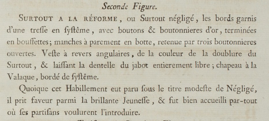 While this Suit had appeared under the modest title of “Négligé“, it took favor among the brilliant Youth, and was well received by all where its partisans wanted to introduce it.