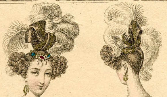 A fairly ordinary early 1830s hairstyle: bracelet on the head, high ‘do in the back, and curls in the front.  This would of course change within a few years.