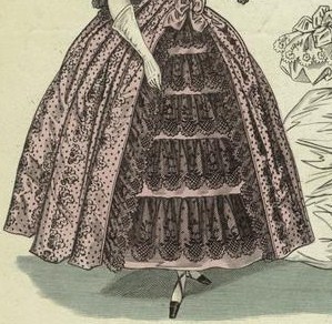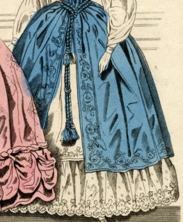 This fabric is very difficult to track down, and I can’t find much of anything about it.  With regard to fabric, “à l’Antique” seems to mean general richness and heaviness.  Another issue of Godey’s describes Toilettes à l’Antique as being made of “velvet satin, broché, damassé, and other rich materials of the ‘olden time'”.