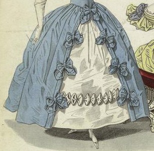 Another touch of historicism.  (Basically the whole thing is historicism.)   The open skirt and a pointed bodice were intended to harken back to the 18th century. It seems to appear more frequently in 1834 than the rest of the decade.