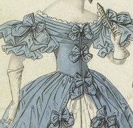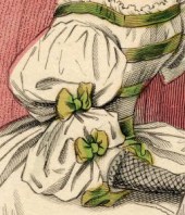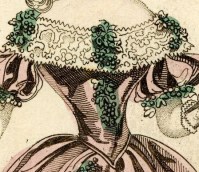 To confirm the period meaning of “jockey”/”jockey sleeve”, I looked through more period publications until I found a good description in the Court Magazine: “A large square collar generally replaces the pelerine, which, falling over the sleeves, forms a jockey, and descends in the front in fichu style.”  While a jockey sleeve is sometimes a long, fitted sleeve with a narrow cuff, in this context it is clearly a flounce over the top of the sleeve, a very common design element in the early 1830s and one imitated in the 1890s.