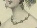 The jewelry was probably intended to be in the antique style itself, to fit in with the general sense of history.  The fan is difficult to figure out: more historicism, obviously, but what exactly is it referring to?  The two possibilities that seem the most likely to me are that it is a folding fan painted with medieval-ish figures, or that it is a handscreen fan.