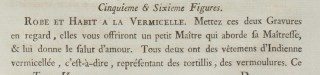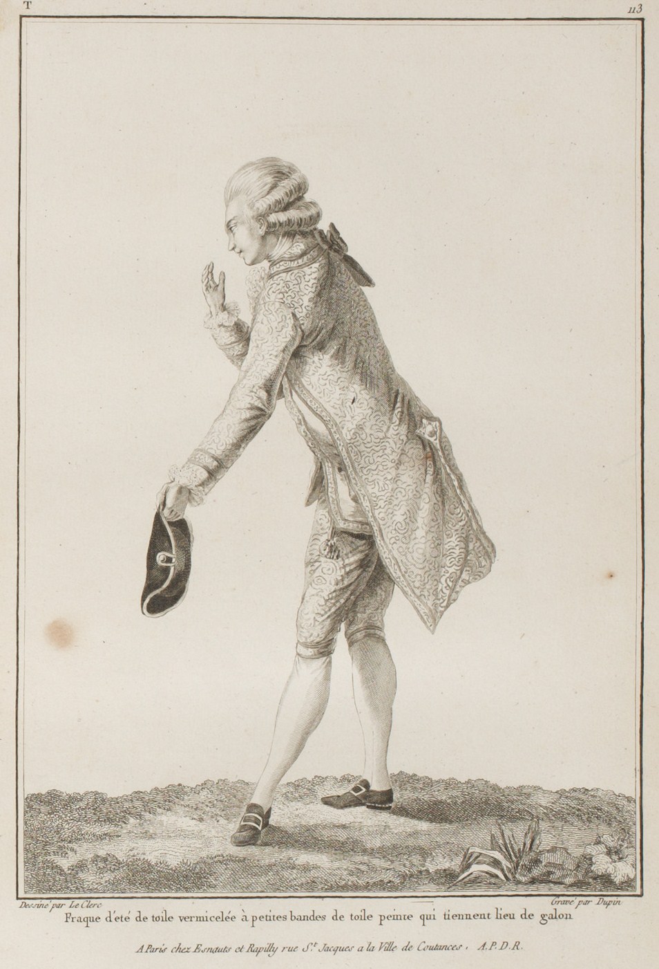 VERMICELLI GOWN AND SUIT. Place these two Prints so they are looking at one another: they will offer you a little Master who addresses his Mistress, and gives her the salute of love. Both have clothes of vermicelli-patterned Indienne, which is to say, representing the twists of woodworm tracks. It has been borrowed from Architecture, where the vermicule ornaments are in use. These indiennes have been extremely fashionable, and both sexes have adopted them.