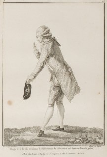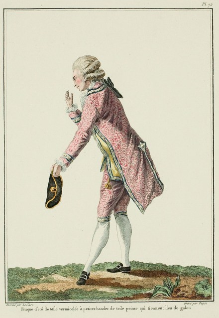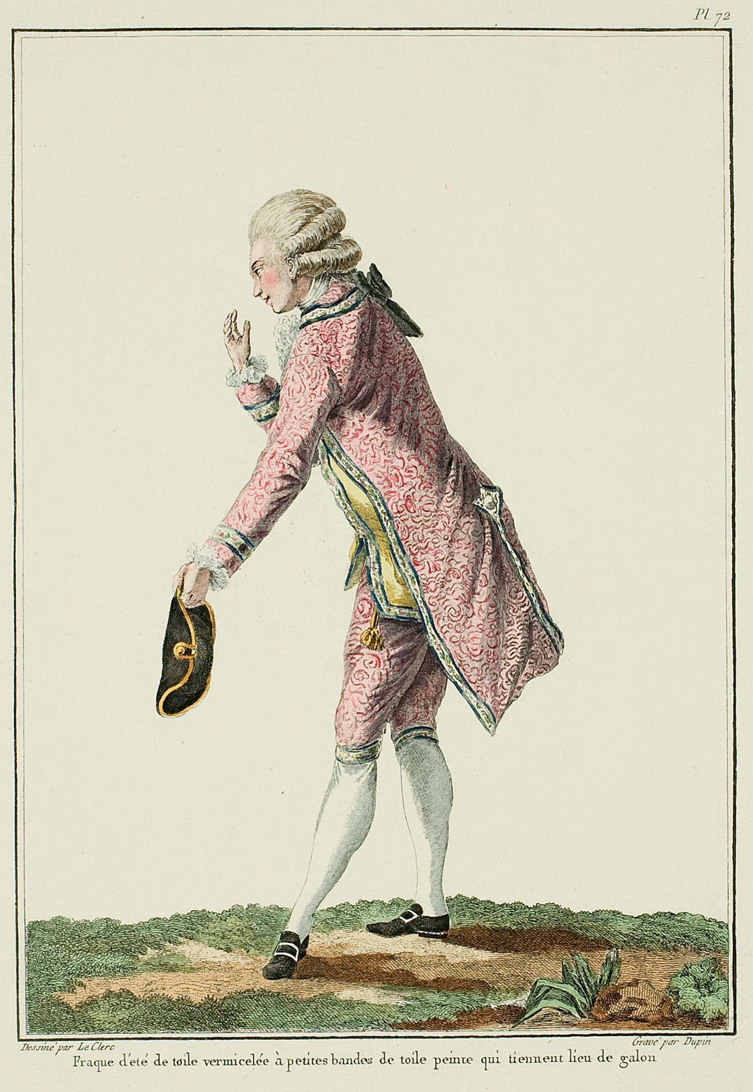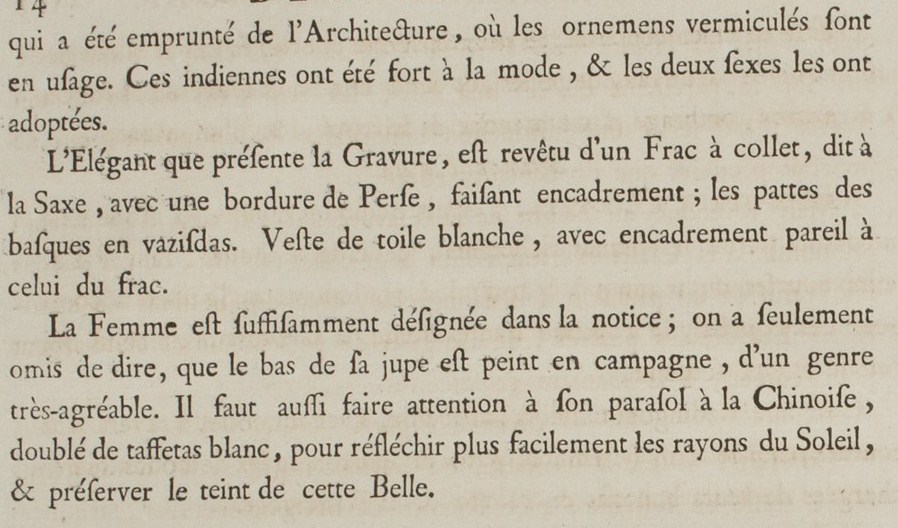 The Elegant Man that the Print presents is dressed in a Frock coat with a collar called à la Saxe, with a Perse border forming a frame. The tabs of the basques are made with vazisdas.* Vest of white linen, with a border matching that of the frock coat.