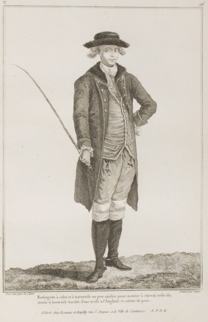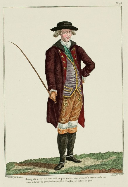 Vest with revers, held back by steel buttons … Kerchief en cravate; jockey hat; two watches; …; gloves and whip in the hand. Lacking only the horse and zest, the Squire would be already far from here.