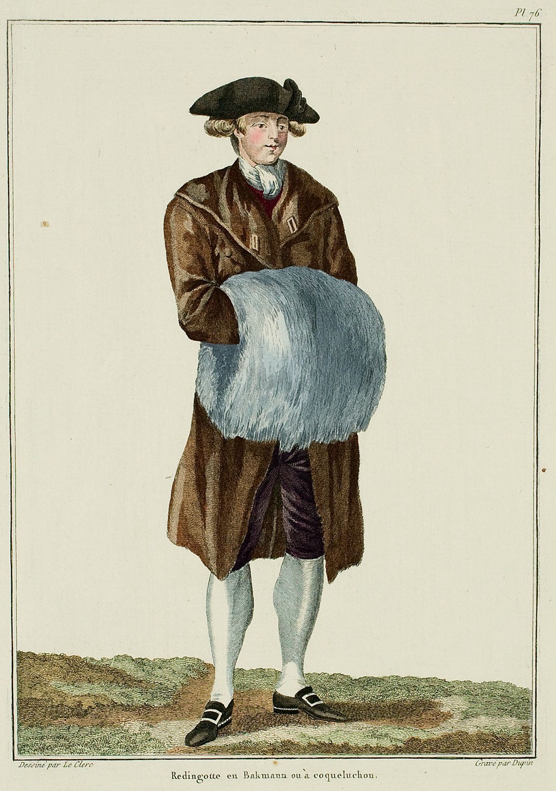 BACKMANN: another type of Redingote, also called by the name of the one who first made use of this garment, destined principally to protect against the intemperacies of the air and the disagreeableness of the streets of Paris during the winter.
