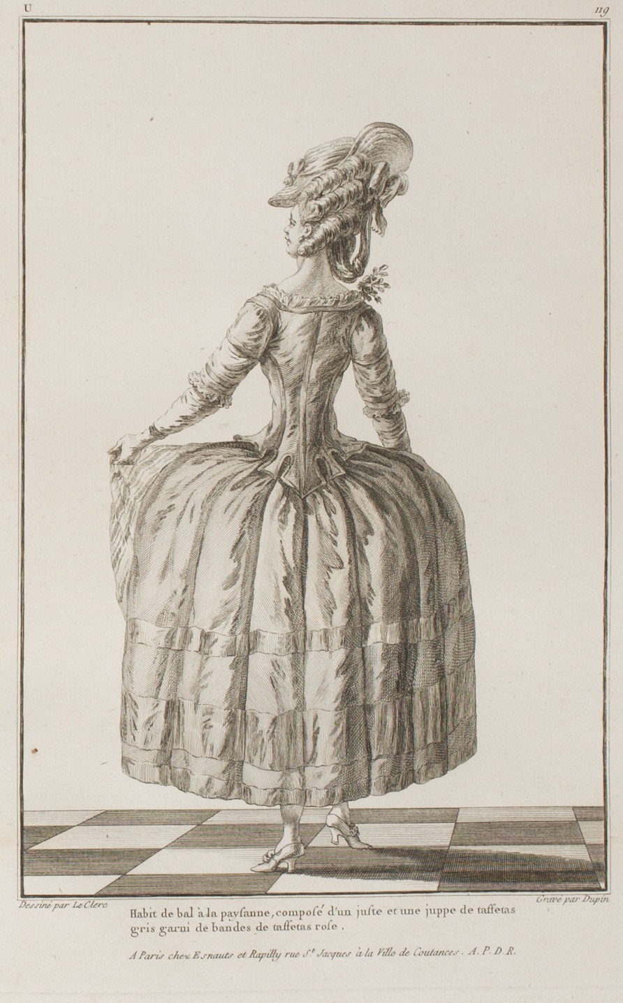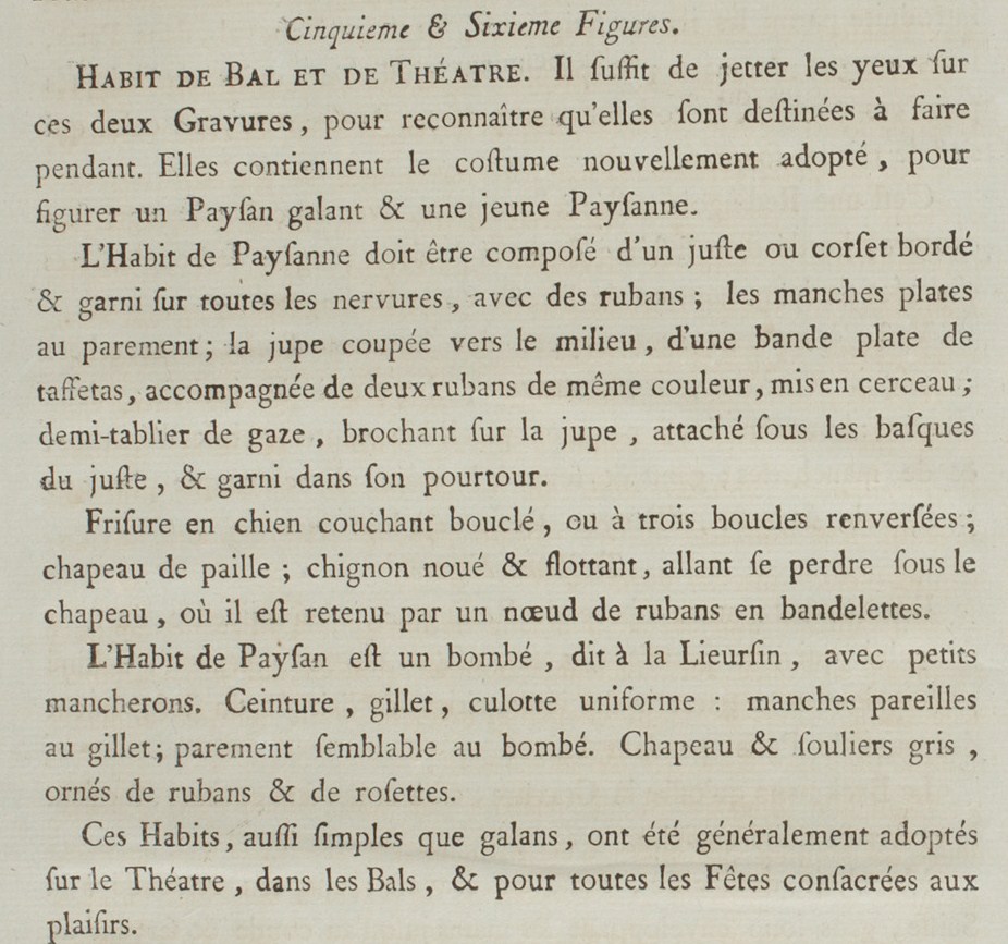The female Peasant’s dress must be composted of a juste or corset edged and trimmed on all the seams with ribbons; the sleeves with a flat parement; the petticoat cut across the middle with a flat band of taffeta accompanied by two ribbons of the same color, placed in circles [around the petticoat]; half-apron of gauze, spreading over the petticoat, attached under the basques of the juste, and trimmed around the whole edge.