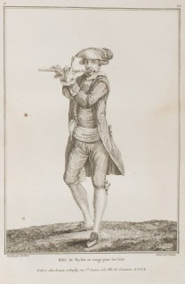 The male Peasant’s dress is a bombe, called “Lieursin” style, with little mancherons. Belt, gilet, and breeches match each other: sleeves match the gilet; the parement is similar to the bombe. Grey hat and shoes, trimmed with ribbons and rosettes.
