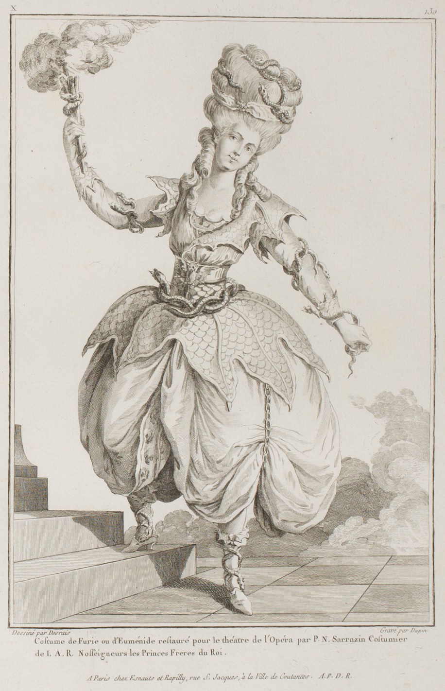 For the ornamenting of the Print, the Artist drew the serpents over the brodequins.* But as this Outfit is intended for dancing, this trim must be removed, as it could obstruct the Dancer’s movements.