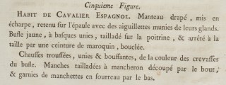 This Spanish Cavalier is represented while removing his boots; this is why his pantaloons, cut at the garter with puffed aglets, can be seen, and the shoes tied with bows. The full costume requires boots, trimmed with gilded spurs armed with rowels.