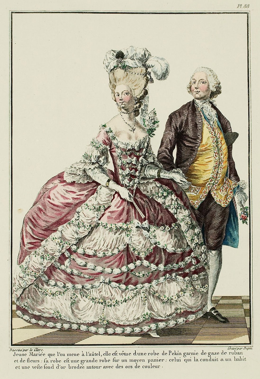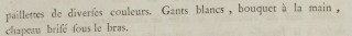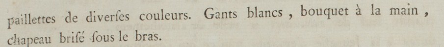 But we return to our Print, and finish. It is said in the caption, that he who conducts the Spouse is dressed in a Suit and a vest with a gold ground. It is necessary to read: dressed in a Suit of spring cannelé velvet, lined with silk of a sharp color; breeches matching the Suit, the whole cut with a vest of cloth of gold, relieved with gold embroidery and sequins of diverse colors. White gloves, bouquet in the hand, chapeau brisé under the arm.