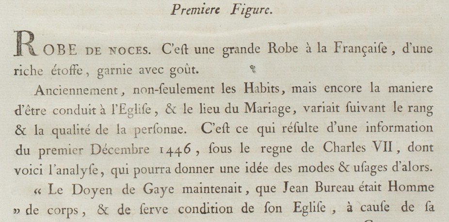 Formerly, not only Dress but also the manner of being conducted to the Church and the place of Marriage varied according to the rank and quality of the person. This is the result of a report from the first of December 1446, in the reign of Charles VII, which is here analyzed, which could give an idea of the fashions and customs of the time.