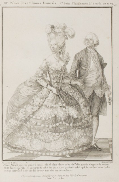 Regarding Women, the etiquette is that their hair is coiffed, with let-down lappets, and they are shown in the Print that we are describing. They must also have on the head, what is called a chapeau. This was formerly a type of crown of flowers; it is now some orange blossom buds, forming a quarter circle, placed behind the head. Capuchins and mantelets are also forbidden, and the hand bouquet must be composed of white flowers.
