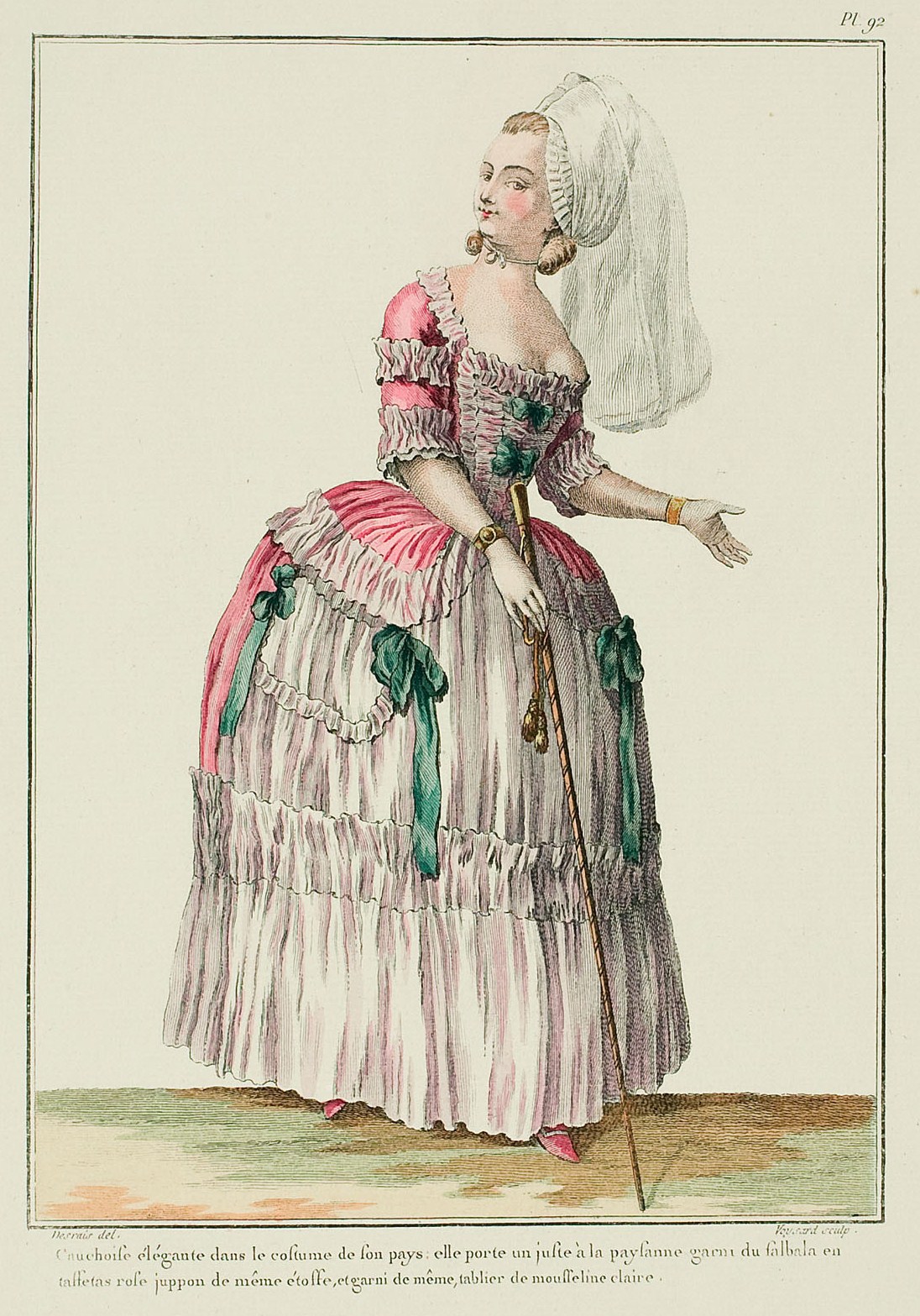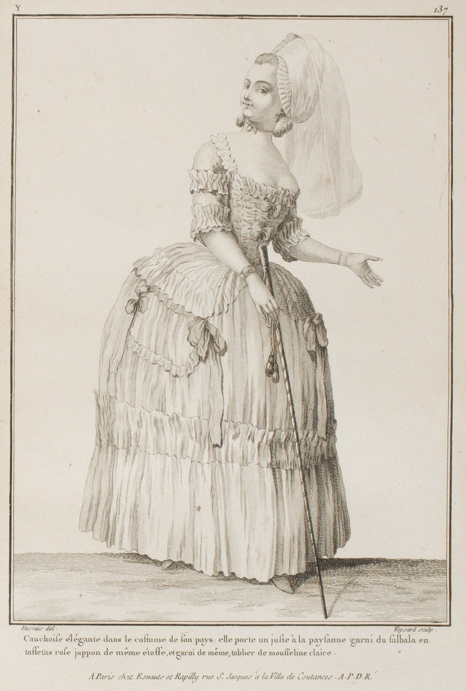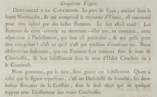 DESHABILLÉ A LA CAUCHOISE. The Pays de Caux, in Haute-Normandy, which contains the kingdom of Yvetot, is renowned for being inhabited by beautiful Women. The fact, is it true? The Women of this country, should they not have this reputation for dress, which is particular to them, and which passes to be very-galant? That is not the question examined here. We observe only that these Women are known as Cauchoises, and their dress as Cauchois or Cauchoise Dress.