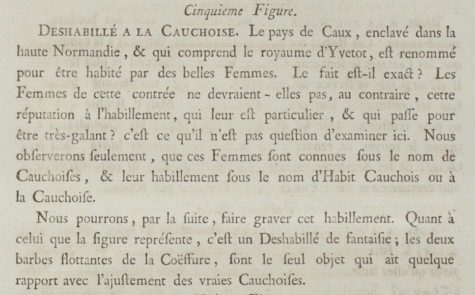 We could, later, engrave this dress. About that which the figure represents, it is a fantasy Deshabillé; the two hanging lappets of the Coiffure are the only object which has some rapport with the dress of the real Cauchoises.