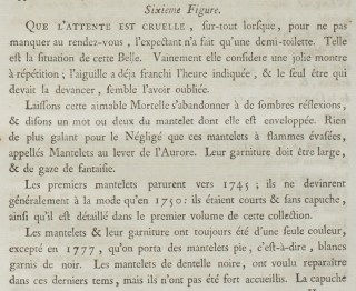 The first mantelets appeared around 1745; they only became generally fashionable in 1750: they were short and without hoods, as was detailed in the first volume of this collection.