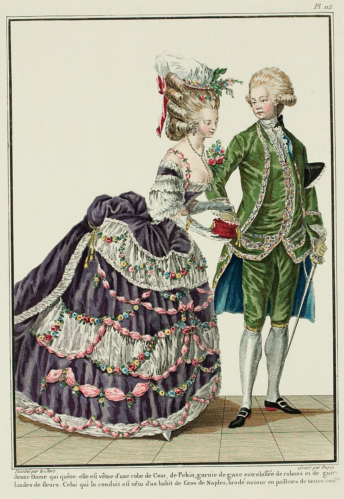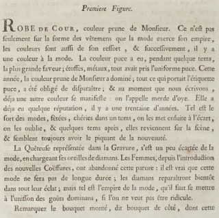 Robe de Cour, in “Monsieur’s plum” color. It is not only on the form of clothes that fashion exercises its empire: colors are also in its purview, and there are successive fashionable colors. The color puce has had, for some time, the greatest favor; fabrics, metals, everything took on a uniform puce. This year, the color “Monsieur’s plum” dominated; everything that carried the puce label has been obliged to disappear; and at the moment that we are writing, already another color is manifesting: it is called “goose droppings”. It has already had some reputation for thirty years. Such is the strength of fashion, celebrated, expensive for a time, they are then put in the discard pile, they are forgotten, and some time after, they come back on the scene and always seeming to have the piquancy of novelty.