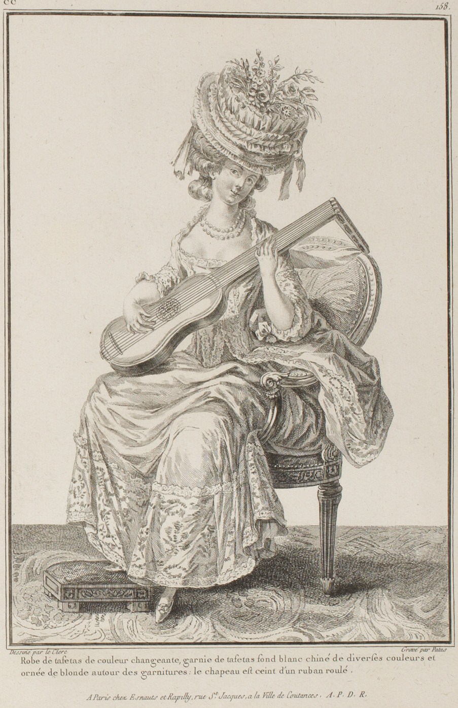 The Musician represented in the Print is sitting on an armchair in the new fashion, that is to say, which has molding made of cardboard. These armchairs, as solid as those of wood, have as much éclat and more lightness. But it is to presume that, despite this circumstance, one will go back to the former armchairs again, those of cardboard only remaining for ornament and decoration.