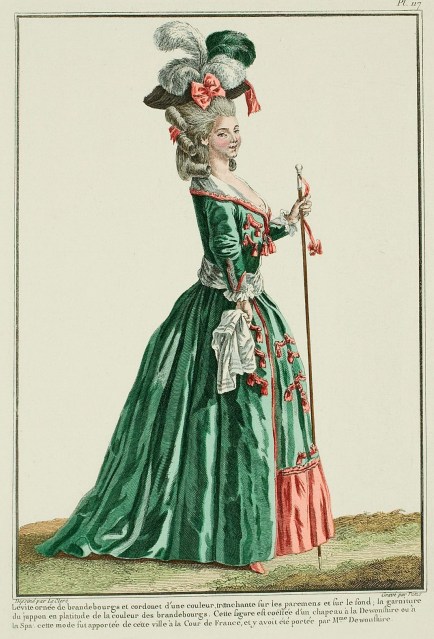 LÉVITE A LA PRUSSIENNE. The Gown and the petticoat trimmed with brandenburgs. Belt in drapery over the Gown, busquée in front,* to free the waist and give it grace. Sleeves and parements à la cavaliere, opening underneath, following the ancient method abandoned by the Military, because it was inconvenient and because the Minister recognized that it was not economical.