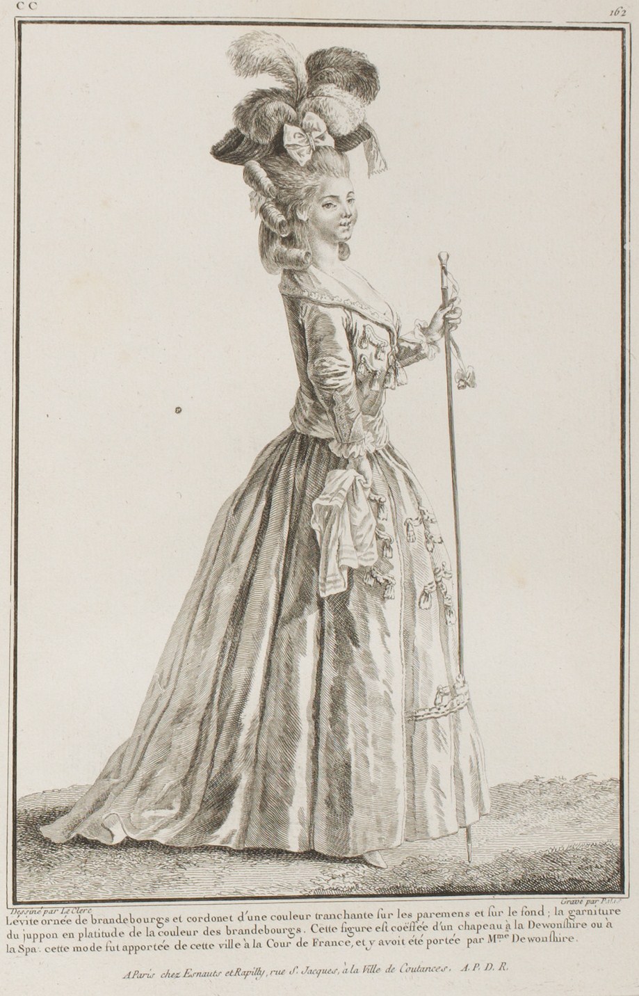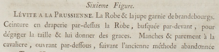 LÉVITE A LA PRUSSIENNE. The Gown and the petticoat trimmed with brandenburgs. Belt in drapery over the Gown, busquée in front,* to free the waist and give it grace. Sleeves and parements à la cavaliere, opening underneath, following the ancient method abandoned by the Military, because it was inconvenient and because the Minister recognized that it was not economical.