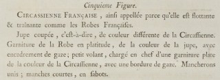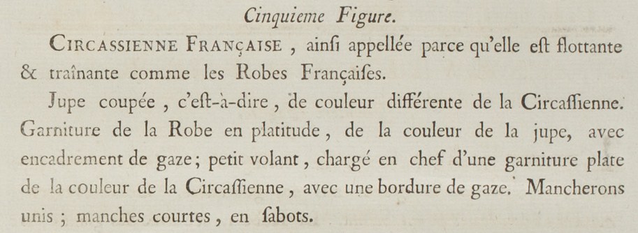 Coupé petticoat, that is to say, of a color different from the Circassienne. Gown trimming en platitude, in the color of the petticoat, with a frame of gauze; little volant, headed with a flat trim in the color of the Circassienne, with a border of gauze. Plain mancherons; short sleeves, in sabot cuffs.