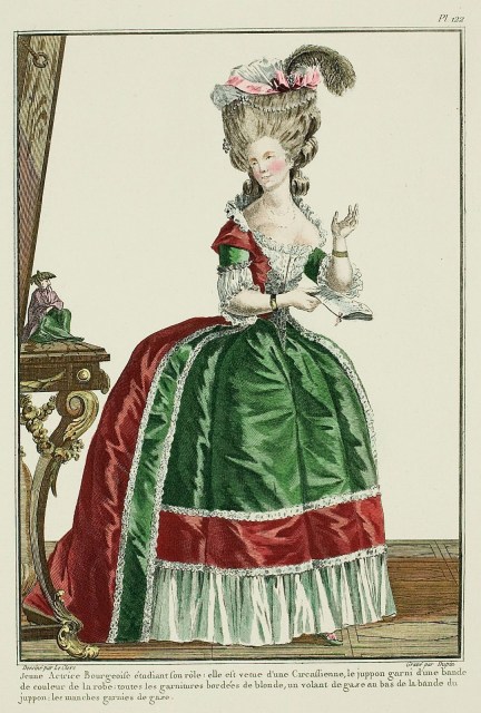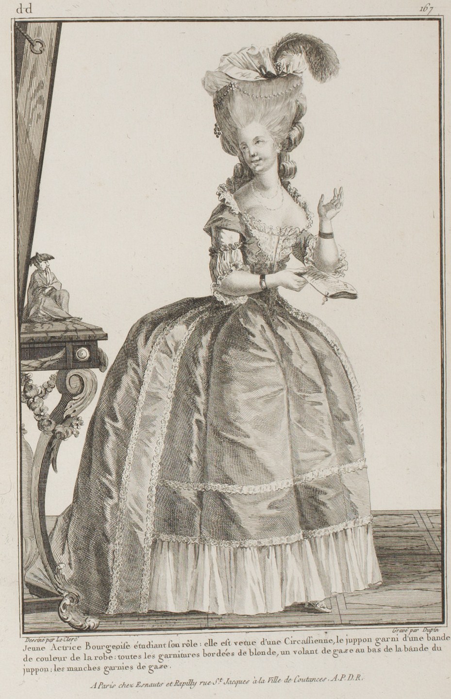 Young Bourgeois Actress studying her role; she is dressed in a Circassienne, the petticoat trimmed with a band in the color of the gown: all the trims are bordered with a blonde lace, a volant of gauze at the bottom of the band on the petticoat: the sleeves trimmed with gauze. (1780)